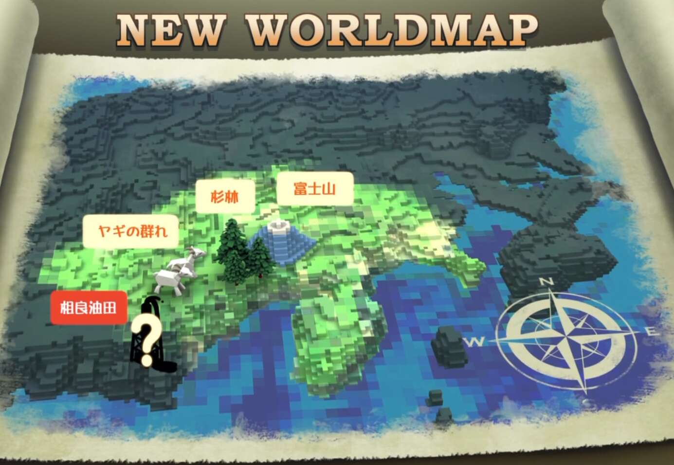 そして、相良油田の捜索とあせて他の食料も気球から絶対に見つけると意気込み、気球を使って空から新しい地図・ワールドマップを作成します。空から見つけた杉林やヤギの群れのポイントを、地図へ次々と記入していきます。