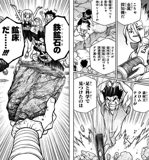 レーダーを作成し、次は大きなエンジンを作成しようとしますが、それには大量の鉄と石油が必要ですが、川ですくう砂鉄では限界があります。一方、レーダーを見たクロムはレーダーで鉱石も探せるのでは?と、閃き、一人で山を探索します。そして地中レーダーを自作し、クロムは一人で鉄鉱石の鉱床を探し当てます。
