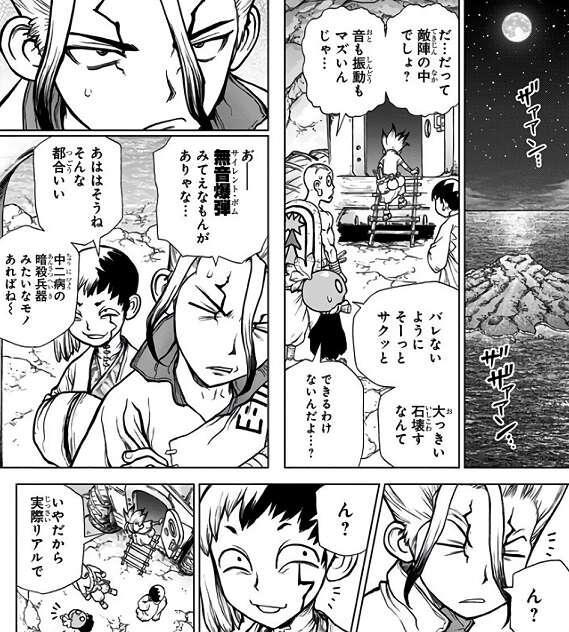 コハクから送られてきた手紙から、千空は頭首の棲む大木のある根元に宇宙船ソユーズが遺されている事を知ります。プラチナは宇宙船ソユーズの中にコンクリートで覆われて保存されていて、コハクはプラチナを取り出すことが出来ません。そこで、千空はプラチナをコンクリートの塊の中から取り出すため、無音爆弾(サイレント・ボム)を作成します。
