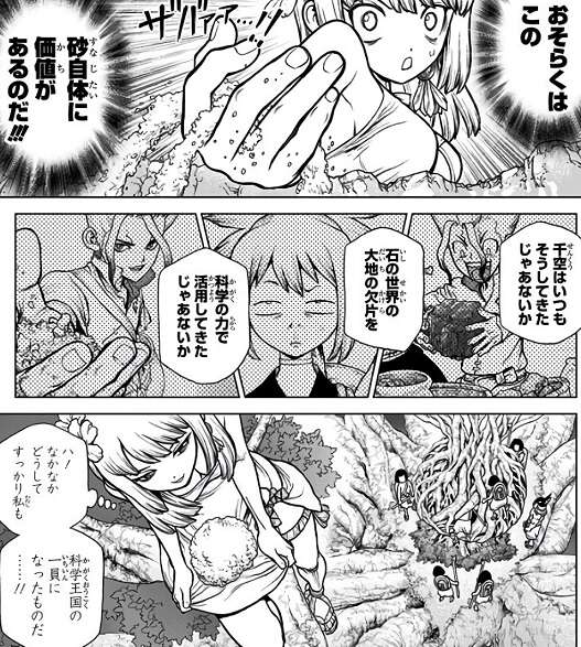 千空から送られてきた無音爆弾(サイレント・ボム)でコンクリートの塊をこじ開けたコハクは中身のプラチナを捜そうとしますが、プラチナが入っていたと思われる容器を割ってしまいます。さらに中身はタダの砂のように見えコハクはショックを受けますが、千空がいつもしていた事を思い出し、この砂自体に価値がある事に気付きます。