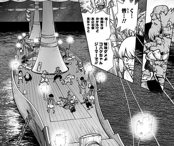 さらに千空の手持ちの化学道具だけでは数も限られ対策が立てられず、船の中のラボカーをゲットしようとします。しかし、船は島の兵士達に占拠されていて手が出せず、目の前でクロムの石像も砕かれていきます。