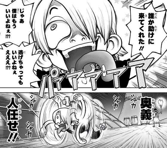 コハクは頭首の棲む大木のある根元に化学王国の勝利のカギを見つけますが、千空達 化学チームと連絡する手段がなく、どう連絡すればいいか悩みます。そこに、千空からネズミのように見えるミニ四駆が送られてきて、何かあった時は連絡手段として使う様に通信が入ります。