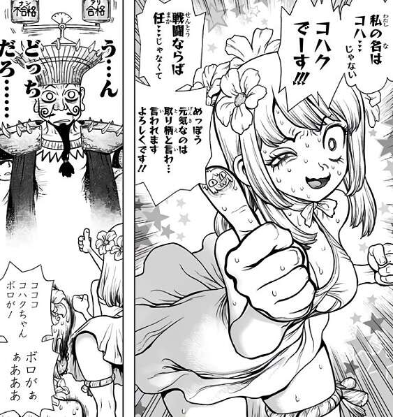 アマリリスから石化武器の話を聞いた千空は、アマリリスやコハクを後宮に潜入させて、頭首一味から石化武器を盗ることにします。それには、コハクが後宮選抜に選ばれる必要がありますが、コハクは男勝りな行動をナチュラルにするので、色々と対策を立てる必要があります。