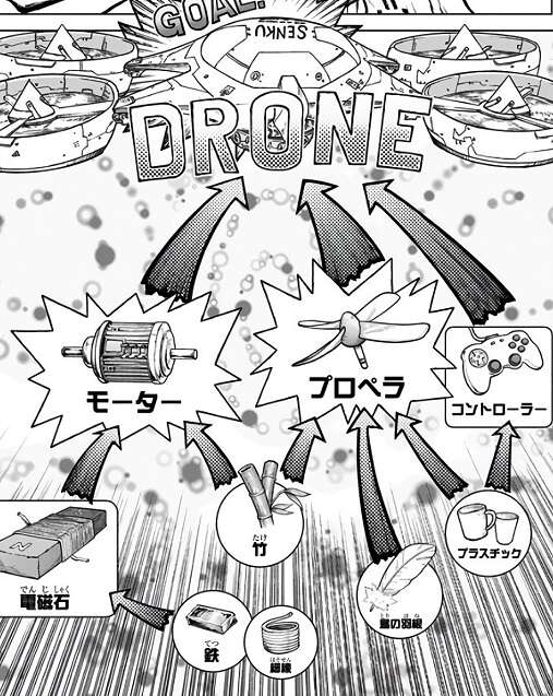 宰相イバラに合格をもらい、後宮に無事潜入したアマリリス、コハク、銀狼の三人はまずは、キリサメや頭首周りの警備体制を偵察し、石化武器を奪う機械を探ります。千空達、化学チームはキリサメが石化武器を投げた瞬間、空中で奪うためにドローンの作成に取り掛かります。