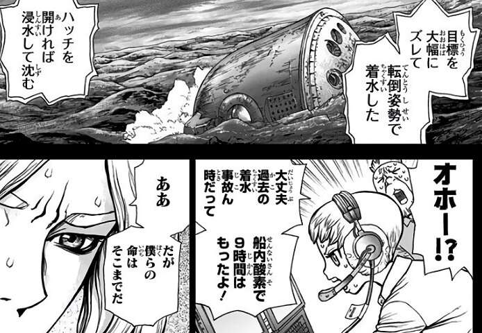 人類が謎の光によって全員石化していた頃、宇宙ステーションにいる千空の父親・百夜は地球に帰還することを決意します。SNSの平均最終書きこみ時刻から、謎の光の発生源を南米と特定した百夜達は、地上に戻る場所を南米の真裏・日本近辺に決めます。