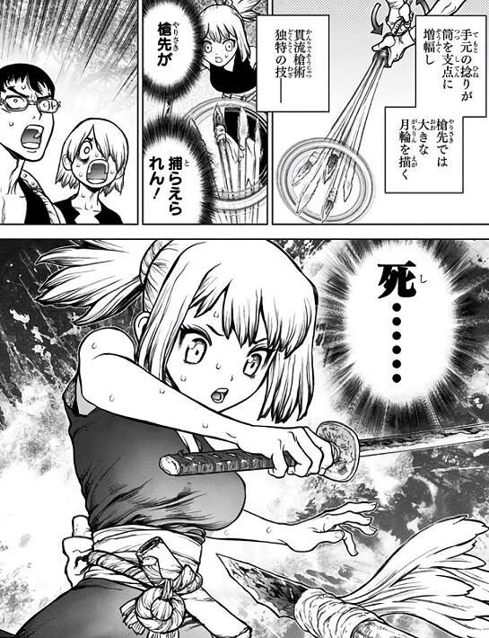 石神村を再び襲撃した戦闘員達を、コハク達は日本刀で撃退します。氷月もマグマとコハクが共闘し日本刀で攻撃しますが、管槍を使う氷月には敵わずマグマはやられて、コハクも追い詰められます。しかし、ゲンが事前に鉄製の刃物で外から切れ込みを入れていたことで、コハクを仕留める寸前に管槍は壊れ、コハクは命拾いします。