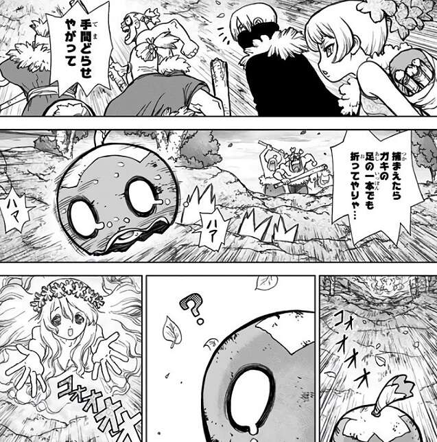 氷月の管槍が壊れたものの氷月達の襲撃は陽動で、氷月の真の狙いは石神村に火をつけて火事を起こすことでした。さらに氷月達は火事の騒ぎに乗じて子供を人質として捕まえようとしますが、スイカは自らを囮となって科学王国の子供を逃がそうとします。