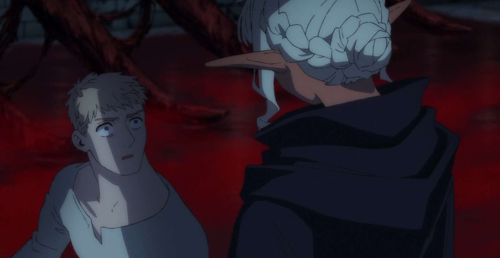第13話では、一気にストーリーが急展開、ファリンを生き返らせたのも束の間、ライオス一行は狂乱の魔術師に襲われ、ライオスとマルシルは動けない状態になってしまいます。さらに、ファリンは狂乱の魔術師に操られたような状態になってしまい、ファリンとはぐれてしまいます。ライオス一行は狂乱の魔術師に壁の中に閉じ込められ、圧死寸前まで追い込められますが、幽霊に助けられ、その後オークの集団と遭遇します。オークの集団のリーダー・リドは第4話で出会ったオークの族長・ゾンの妹で、リドは最初チルチャック達を殺そうとしますが、センシがゾンと交わした約束や経緯を説明して見逃してもらいます。その後、ライオスとマルシルをオークの調合薬で治療してもらい、集落で休ませてもらいます。その後、チルチャックはライオスにこれ以上の迷宮の探索は無理と説得し、一旦地上へ戻る事になります。