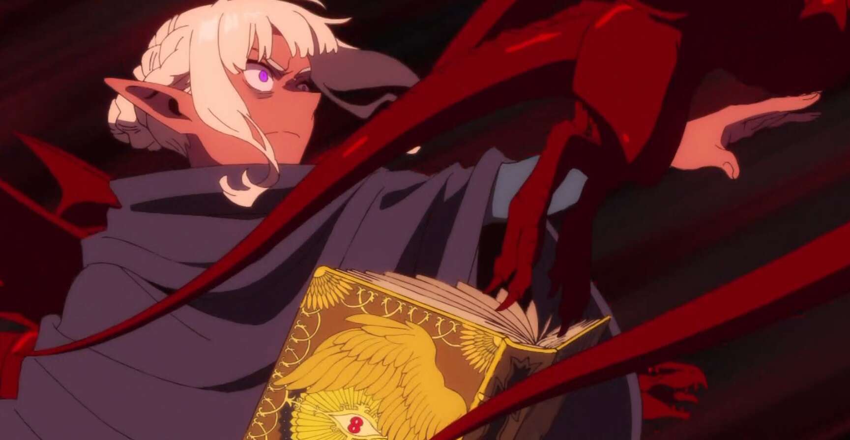 狂乱の魔術師はライオスを問い詰めようとしますが、マルシルが魔法で狂乱の魔術師を威嚇して止めます。ライオスはその隙にファリンを連れて行こうと話しかけますが、ファリンはライオスにうるさいと叫ぶと、ライオスを振りほどこうとして肘で腹を殴ります。すると、ファリンの力とは思えない怪力でライオスは吹っ飛ばされます。一方、狂乱の魔術師は魔導書を開くと古代魔術を詠唱し、レッドドラゴンの血肉で作った使い魔でライオス達を攻撃します。