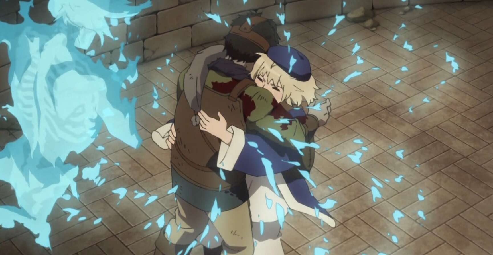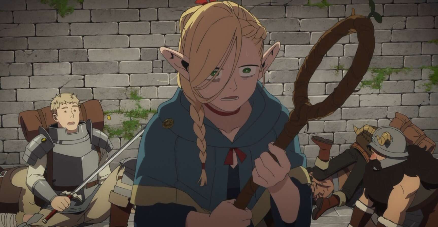 何の前振りもなく急にカブルー一行が登場しました。このカブルーは幼い頃に迷宮に絡んでひどい体験をしていて、この迷宮でも狂乱の魔術師を倒し、迷宮の呪いを解くことを目的にしています。カブルーに昔何があったかに関してはだいぶ先ですが、アニメでも描かれると思います。またカブルー一行がこの後どうなったかも、何話か先ですぐに再登場するので、その時に描かれます。