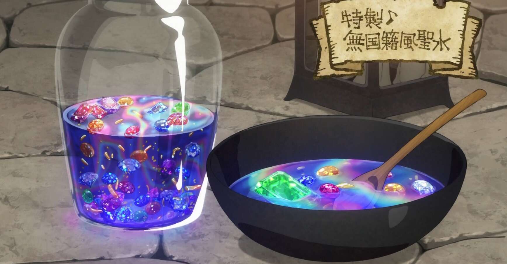 このままでは霊に追いつかれると、センシは霊を追い払うための魔除けの聖水を用意し始めます。宝虫の巣のジャムやスライムの肝、リキュール、塩、砂糖などを使い、センシは無国籍風聖水を作成します。聖水を瓶に詰め、センシは瓶で霊を次々と殴っていき、霊を追い払っていきます。