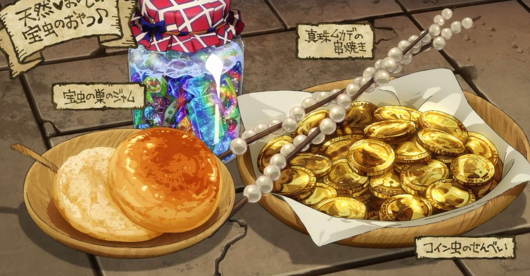 センシは動けなくなった宝虫を選別し、食べれる宝虫と食べれない宝虫に分けます。そして、食べれる宝虫の内コイン虫を油で熱したフライパンで炒め、せんべいにします。また、真珠ムカデは串焼きにし、宝虫の巣は煮詰めてジャムにします。