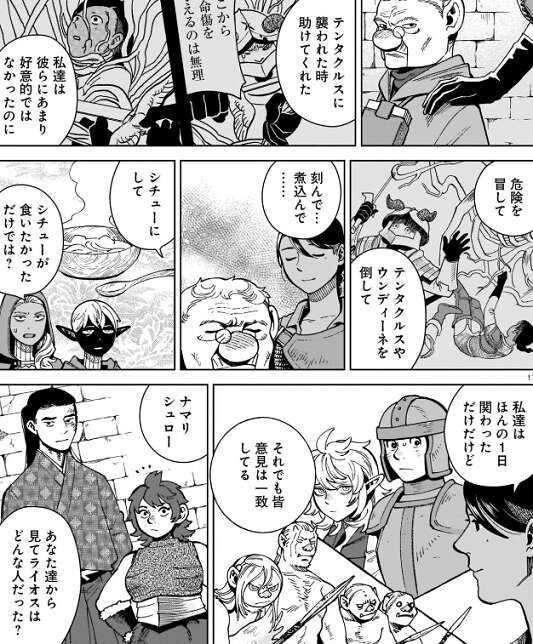 フラメラは、主次第で迷宮内のルールが変わることを恐れ、迷宮の主は遅かれ早かれ必ず狂う、魔物が大好きなライオスはその時どうする?とナマリ達に問います。戯れに魔物を作り出したり、人を魔物に変えたりしないと言えるかね?と、言われ、ナマリ達は、否定できず、むしろライオスならやりかねないかも…、と心の中で思ってしまいます。
