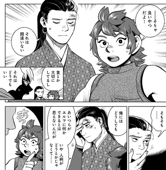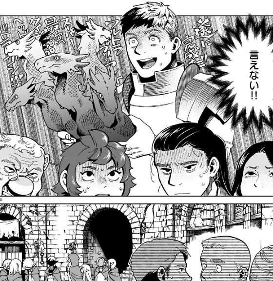 ナマリやシュローも、ライオスは良いやつだよ!と言いますが、シュローは、そもそもあいつらがエルフに何かできるとは思えないんだが、と言い、ライオス達に仲間を攻撃された、というカナリア隊の話が真実なのか怪しい以上、迷宮に関する話も受け入れ難いと主張し、エルフには従えないとナマリ達やオーク達は武器を構えます。