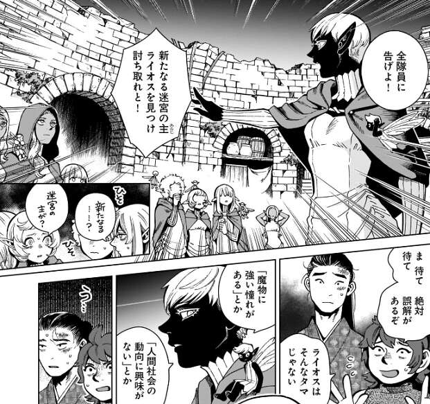 ナマリとシュローが、ライオス達が迷宮の主になりかわった?という話をしていると、カナリア隊の肌の黒いエルフ・フラメラがその話を聞き、全隊員に新たな迷宮の主・ライオスを見つけ討ち取るように指示します。ナマリが慌てて、絶対誤解があるぞ、ライオスはそんなタマじゃない、とエルフに言いますが、肌の黒いエルフは、魔物に強い憧れがある、人間社会の動向に興味がない、というライオスの情報を知っていて、ライオスを危険視します。
