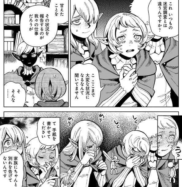 フラメラは、迷宮が膨張していてこのままでは危険という事で、まずは部下に結界術師を集めさせます。しかし、迷宮にいる冒険者達は迷宮内が膨張して?それがなんだ、蘇生はできるし、金も稼げる、と問題にせず楽観的です。一方、カナリア隊のエルフの中には、いつもの迷宮調査とは違うことに気付き、ここまで大変な状況になるなんて聞いていないと不安がります。甘えたことを、その状況を報告するのが我々の仕事だろうが、と肌の黒いエルフが言うと、部下のエルフ達は急に泣き出し、家族に手紙を書かせて欲しいと言い出します。