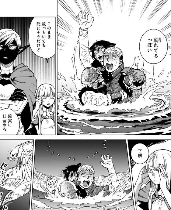 部下のエルフに使い魔を使ってライオスを探し出すように命令すると、すぐにライオスは見つかります。湖で溺れているライオス達を見てエルフは、このまま放っといても死にそうだけど、と言いますが、フラメラは確実に仕留めるように言い、使い魔達にライオス達を攻撃させようとします。