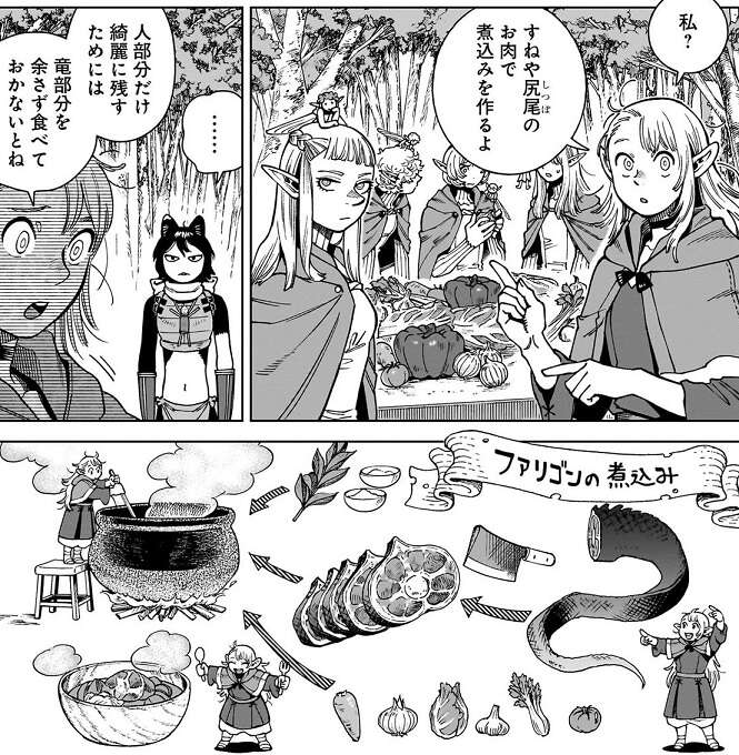 ファリンの竜部分の料理の下ごしらえは順調に進んでいます。センシはミートパイ、チルチャックはソーセージ、マルシルはすねや尻尾の肉の煮込みを作って、竜部分の食材を消費しようとしています。そして、自由に生きたいイヅツミですが、ヤアドと一緒に海を渡って黒魔術使いを倒す旅に出ようと(一方的に)考えていましたが、ヤアドはライオスを王にする事に必死で、ヤアドと旅に出る事は難しそうです。他にも自分の隙に出来ないことにイヅツミはムカつきますが、皆と話して生きていくには何でもは好きに出来ない事を知ります。そして今イヅツミが一番やりたい事、センシが作ったミートパイを食べる事に専念することにします。いよいよ食事の時間が始まりそうですが、ファリンの蘇生はいつするんでしょうか?竜部分を全て食べてからだと、かなり後になりそうですが…。