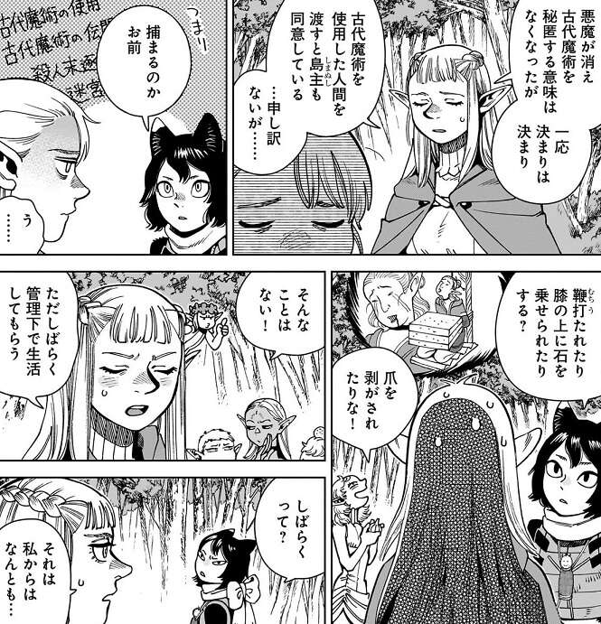 マルシルはパッタドルと今後の事を話していて、マルシルが古代魔術を使用した事実は消えないので、カナリア隊と一緒に行き、しばらくはカナリア隊?西方エルフの国?の管理下で生活をすることになるようです。マルシルは合意の上でやったことだし、やらなければもっと後悔していた、と納得しているようですが、期限次第ではみんなと長い間会えなくなることが寂しいようです。しかし、マルシル達の功績を考えれば酌量の余地はありそうです、手紙のやり取りくらいなら出来るかもしれない、とマルシルはパッタドルから励まされます。