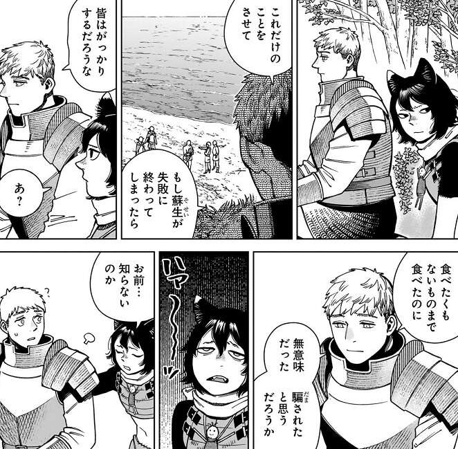 そもそもライオスが翼獅子を食うから皆が苦労する羽目になった、とイヅツミが言うと、ライオスは、責任取らないとな、と答えます。そして、ライオスがイヅツミにこの先どうするか聞くと、イヅツミは迷わずセンシの作ったミートパイを食べる、と答えます。