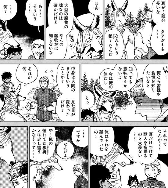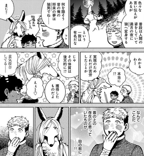 狼男の話では、カナリア隊のリシオンが狼男のような獣人になれると知って感激します。ライオスの昔の将来の夢は狼男で、リシオンとその話で意気投合して盛り上がります。