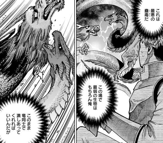 竜同士が争いを始めたおかげでライオスは何とか助かりますが、竜同士の争いに巻き込まれ竜の尻尾の下敷きになってしまいます。何とか逃げ出しますが、肋骨が折れてしまい下敷きになった衝撃で着ている鎧もダメになってしまいます。竜達の争いを観察しつつ、ライオスはこのまま竜同士が潰しあってくれることを期待しますが、シスルは竜達に争いを止めるように命令します。