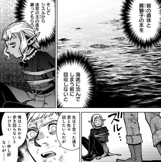 シスルを拘束したライオスですがろっ骨が折れていて重傷で、魔法で治癒を行います。しかし、ライオスの魔力ではあまり傷を治癒することは出来ません。ライオスはある程度治癒できた所で、皆の遺体と翼獅子の本を海底に沈む前に回収しようと考え、シスルを背負うと海に遺体と本を探しに行きます。