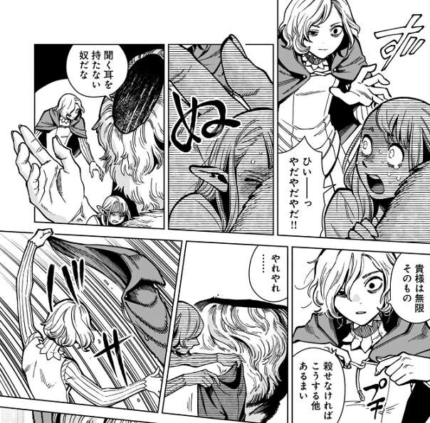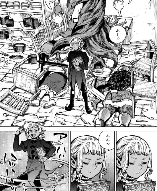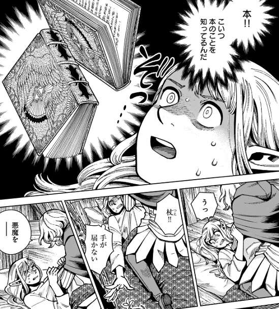 二日酔いで寝込んでいたマルシルの前に、急にミスルン隊長が現れます。ミスルン隊長は魔術書を探しますが、倒れているシスルが持っていないと分かると、マルシルを問い詰め始めます。悪魔を見たか?悪魔はどこに消えた?どんな姿をしていた?何を話した?と、ミスルン隊長は質問攻めにしますが、マルシルは突然でミスルン隊長の話を理解できません。しかし“本”という単語を聞き、マルシルは名前を知らないエルフが本を知っていることに驚き、とっさにミスルン隊長を爆発魔法で攻撃します。