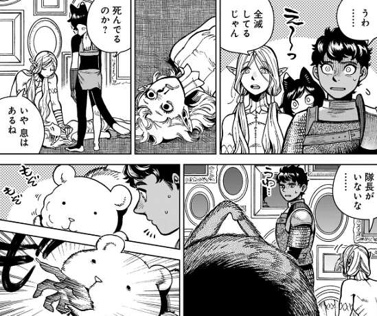幻覚術によって意識を失っているライオス達を、カブルーは手を引っ張って連れて行こうとしますが、家の中の構造が変わっていることに気付きます。一方、カナリア隊は翼獅子の大グモによって、リシオン以外ほぼ全滅しており、ミスルン隊長も魔力切れの状態で気を失ってしまいます。