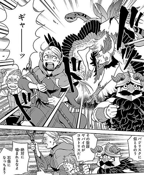 始めて魔術で治療したため魔力酔いを起こしたライオスを小屋において、チルチャック達は迷宮の変動に法則性がないか調査しに外へ出かけます。法則性がないか観察していると、足元の地面がせり出してきて慌てて別の場所へ移動すると、そこにはコカトリスの巣がありました。突然現れたコカトリスが襲いかかって来て、チルチャック達は慌てて逃げ出します。