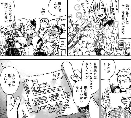 ライオス達が現代のデパ地下に、ファリンの誕生日ケーキを買いに来た、という設定です。目的地のお店まで行くにも、現代人でないライオス達には一苦労のようです。