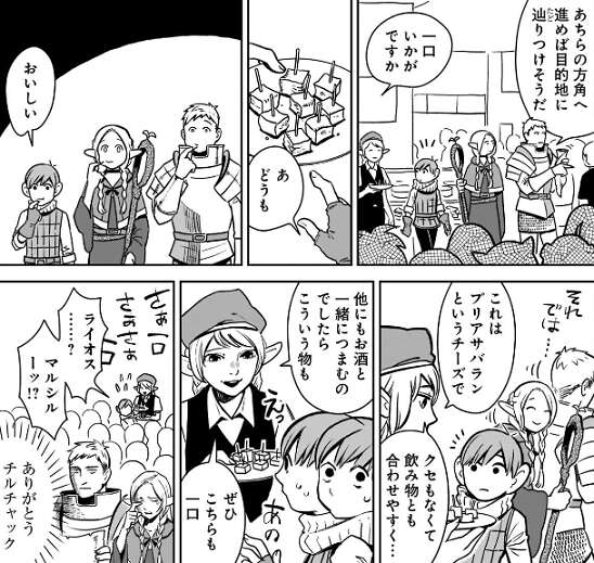 ライオスは、エルフは魔法が得意、ハーフフットは手先が器用、ノームは政令の扱いに長ける、ドワーフは鍛冶に長ける、のような突出したものがない、と以前から悩んでいます。ナマリから、歌や踊りが得意、歌ったり踊ったりする人の多さ、が他の人種では珍しいと慰められます。