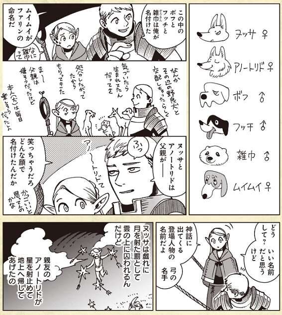 描き下ろし漫画では、実家で飼っていた犬に関する命名についてです。ライオスは父親との仲は微妙だったようで、父親が犬につけた名前の由来を知らなかったようです。マルシルに言われて、初めて知ったようです。