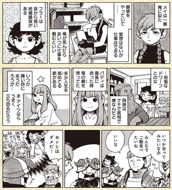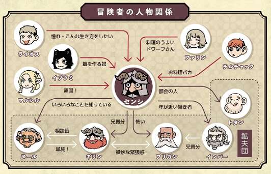 人間関係は、ライオス一行の中では料理をする人として定着しています。鉱夫団の中では、皆と年が離れているので子供扱いされることも多いです。