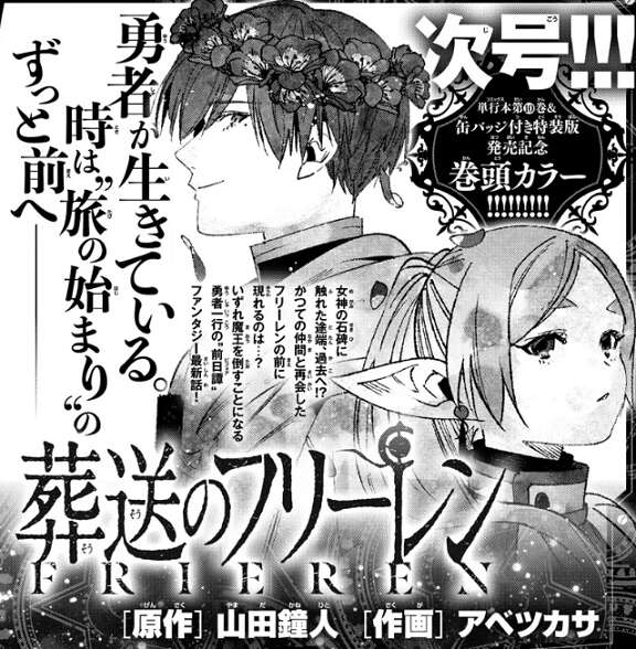 1月18日発売の2023年8号に掲載された後、休載となっていた葬送のフリーレンですが、3月22日発売予定の2023年17号で連載再開されることが、2023年16号で発表されました。