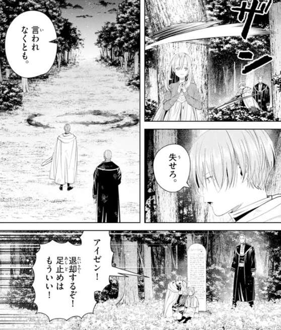 ソリテールの言葉を聞き、失せるようにヒンメルは言います。そして、アイゼンにも退却するように叫びます。一方、リヴァーレはアイゼンに、よもや敵に背を向けるとは言うまいな、と挑発します。