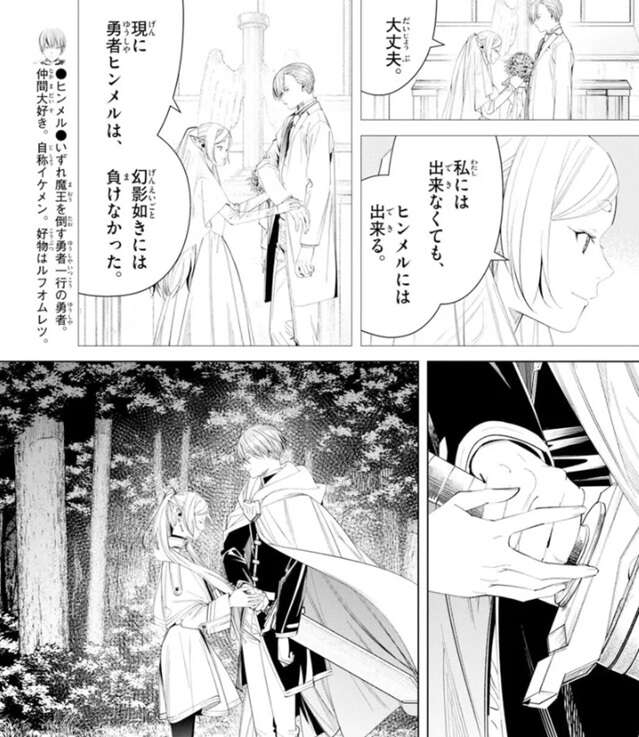ハイターはグラオザームとソリテールの同時攻撃にさらされ、さらにヒンメルとフリーレンを守りながら戦っています。グラオザームの幻影に捕らわれているヒンメルですが、誓いのキスをする段階になって、フリーレンに打開策を聞いています。ヒンメルはグラオザームの幻影には気づいているようですが、まだ幻影の中からは抜け出せていないようです。