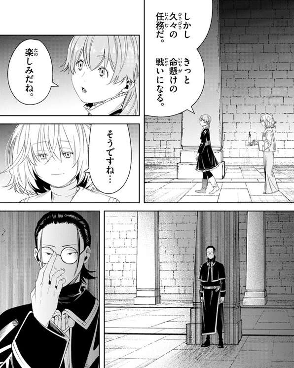 死ぬほど痛くて苦しいけど―、と言った所でイーリスは周りを気にします。しかし気のせいだったとイーリスは言い、しかし久々の任務だ、きっと命懸けの戦いになる、楽しみだね、と任務の話をしルティーネも、そうですね…、と答えます。一方、地下通路の柱の陰ではファルシュが、密かに二人を監視していました。一方、ガゼレはヴォルフの店を訪れていて、ツケを払いに来ていました。ガゼレは死ぬ前にツケを払いに来たと言いますが、縁起でもないこと言わないでよ、とヴォルフは注意します。