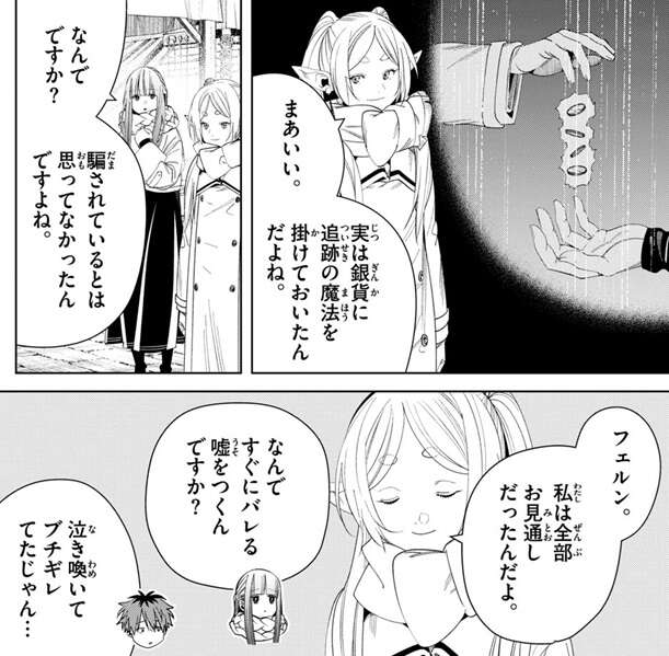 場面は魔道具を返品に来たフリーレン一行に移りますが、露天商のガゼレの店は当然、もうありません。逃げたな、とフリーレンはつぶやきますが、実は銀貨に追跡の魔法を掛けておいたんだよ、と銀貨に仕掛けをしていた事をフェルンとシュタルクに明かします。あの時フリーレンは魔道具が偽物だと気付いておらず、騙されているとは思っていなかったはずだとフェルンは言いますが、フリーレンは、私は全部お見通しだったんだよ、とフェルンに答えます。しかしフェルンからは、なんですぐにバレる嘘をつくんですか?とツッコまれ、泣きわめいてブチギレてたじゃん、とシュタルクからもツッコまれます。