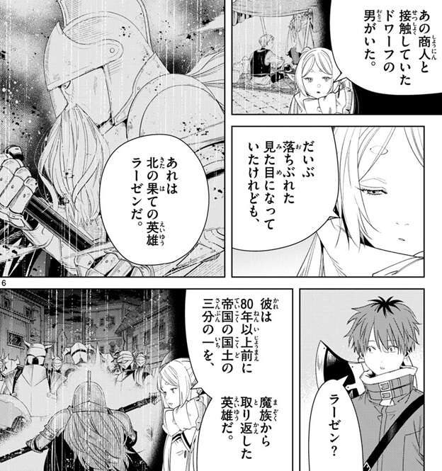 まあ冗談は置いといて、とフリーレンは言うと、ガゼレは戦士だと言い、影なる戦士の可能性を指摘します。しかしシュタルクはそれだけで決めつけられないと言うと、元戦士の商人なんて珍しくないと言いますが、あの商人と接触していたドワーフの男がいた、とフリーレンは言います。だいぶ落ちぶれた見た目になっていたけれども、あのドワーフの男は北の果ての英雄ラーゼンだ、とフリーレンは言います。彼は80年以上前に帝国の国土の三分の一を、魔族から取り返した英雄だ、とシュタルクにラーゼンの事を説明します。