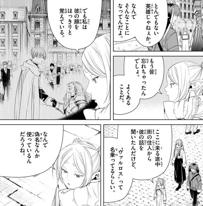 とんでもない英雄じゃねぇか、なんでそんなことになってんだよ、とシュタルクが言いますが、もう皆忘れちゃったんでしょ、よくあることだ、とフリーレンは答えます。しかし、ラーゼンとヒンメル一行は会った事があるようで、フリーレンは彼の顔をはっきり覚えていると言います。さらにフリーレンは街の住人に話を聞いて、ラーゼンが今は“ヴァルロス”と偽名を使っている事も把握していました。なので、フリーレンはこれを偶然と思っておらず、ガゼレを影なる戦士と疑っているようです。