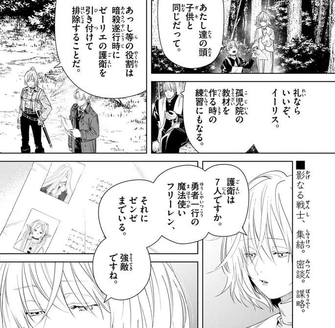 影なる戦士八人が、今回の任務のリストの確認を始めます。影なる戦士八人の任務の役割は、暗殺遂行時にゼーリエの護衛を引き付けて排除することだそうです。護衛は七人となっていて、フリーレン、ゼンゼがリストに載っています。