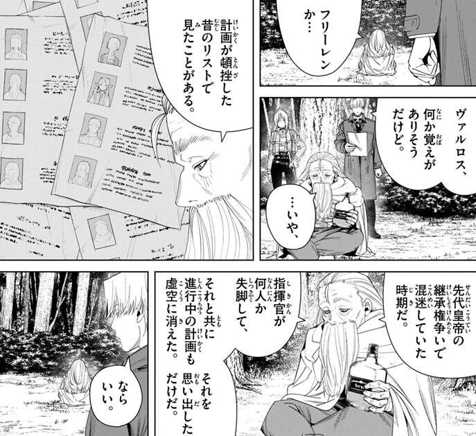 フリーレンの名前を聞いて、ヴァルロスは計画が頓挫した昔のリストで見たことがある、と言います。先代皇帝の継承権争いで混迷していた時期のリストのようで、指揮官が何人か失脚して、それと共に進行中の計画も虚空に消えたそうです。ヴァルロスが言っている内容から、計画が頓挫した昔のリストとは第124話でラダールが受け取ったリストと同じ物のように思えます。