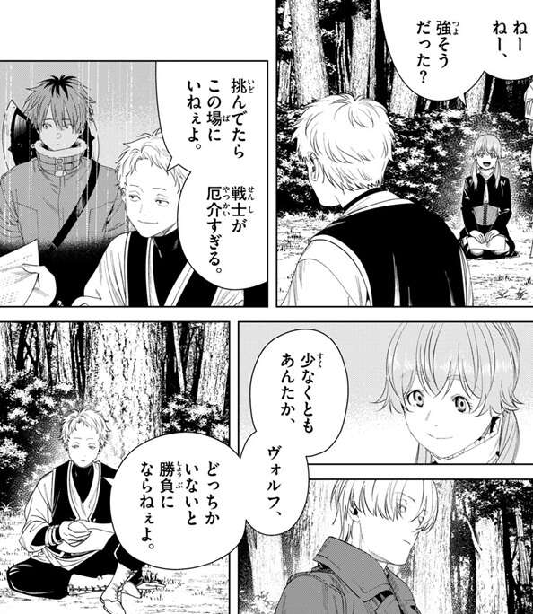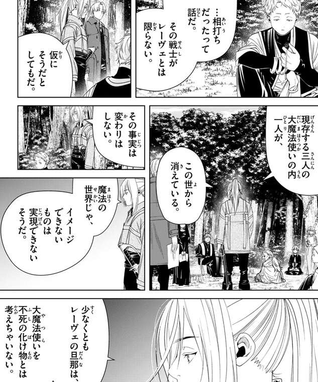 ガゼレはミーヌスと名も無き戦士は相打ちだったという話をして、その戦士がレーヴェとは限らないと言いますが、シュリットは仮にそうだとしても、現存する三人の大魔法使いの内一人が、この世から消えた事実は変わりないと言い、少なくともレーヴェの旦那は大魔法使いを不死の化け物と考えちゃいない、とゼーリエ暗殺は可能とレーヴェが考えている事を伝えます。