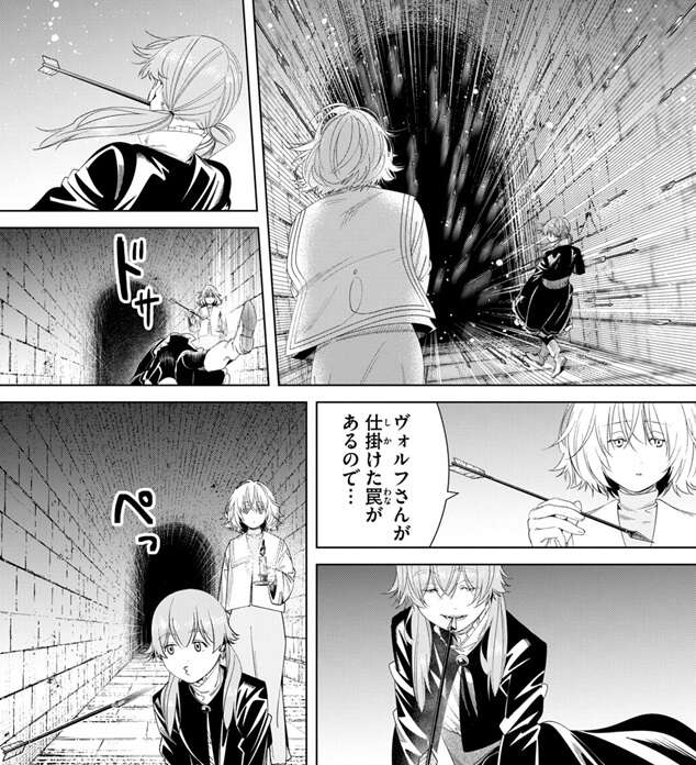 走ると危ないとルティーネが注意した次の瞬間、罠の弓矢が何本か飛んできて、一本がイーリスの顔面に命中します。ヴォルフが仕掛けた罠のようですが、イーリスは飛んできた弓矢を歯で受け止めていました。イーリスは歯で受け止めた弓矢を、ペッ、と吐き捨てると、言うの遅いって、もー、とルティーネに不満を言います。