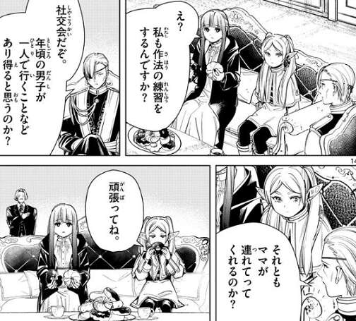 一方、他人事だったフェルンはもりもりとパンを食べていると、オルデン卿から作法の練習をするように言われます。社交界だから年頃の男子、一人で行かせられないと言われ、それともママが連れてってくれるのか?と聞かれます。それを聞きフリーレンは、フェルンに頑張るように言います。