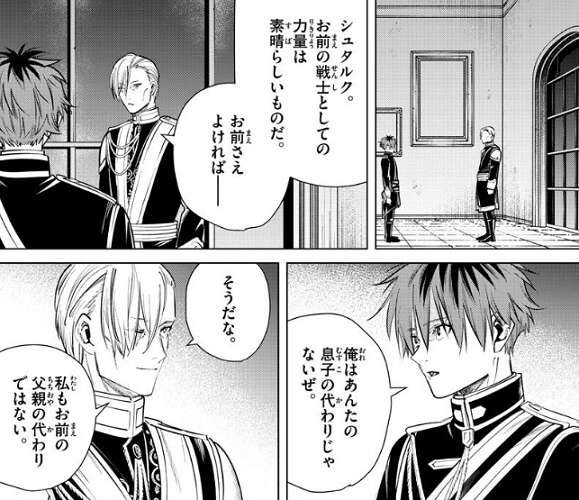 息子のヴィルトとは喧嘩別れだったようで、“お前のかおなんて二度と見たくない”と心にも無い言葉を言ったことを、オルデン卿はずっと後悔しているようです。シュタルクを見つけたときは奇跡だと思ったんだ、とオルデン卿は言いますが、なら尚更ここには残れねぇな、とシュタルクは答えます。シュタルクはアイゼンを思い出しながら、オレも心に無い言葉を言っちまったんだ、と言います。そして、だから旅の思い出話をたっぷりと持って帰らねぇと駄目なんだ、とシュタルクは改めてオルデン卿の願いを断ります。それを聞いて一言、……そうか、とオルデン卿はつぶやきます。