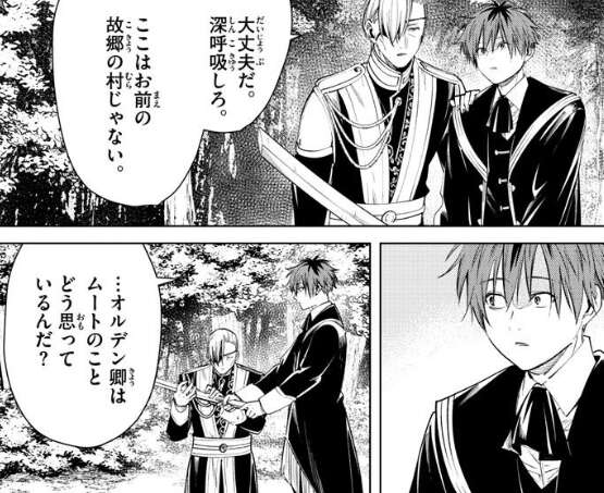 するとオルデン卿は深呼吸するように言い、ここはお前の故郷の村じゃない、とシュタルクに助言します。シュタルクはオルデン卿にムートの事をどう思っているか聞くと、兄ほどの才はないが努力家で、いつか私よりも強い騎士になる、とオルデン卿は言います。それを聞いたシュタルクは、ムートにその事を言ってやったほうがいいと言いますが、いつも言っているが、だから調子に乗ってなかなか上達しないとオルデン卿から言われます。それを聞いたシュタルクは、それは大問題だ、と答えます。