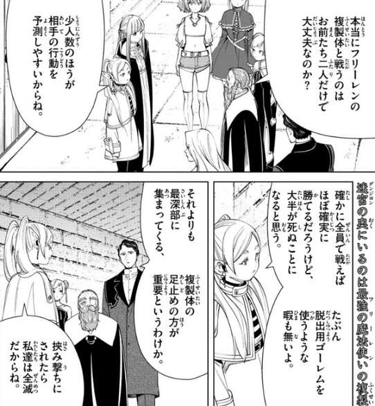 フリーレンの複製体と戦うのは、フリーレンとフェルンの二人だけで他のメンバーは最深部に集まってくる他の複製体の足止めをすることになります。全員で戦えばほぼ確実に勝てるだろうけど、大半が死ぬことになると思う、とフリーレンは言い、それよりも複製体に挟み撃ちにされたら全滅なので、そちらを防ぐ方が重要という考えです。