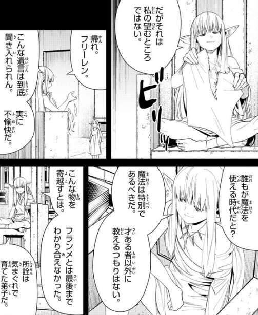 ゼーリエは、人類の誰もが魔法を使える時代がやってくると予言し、さらに遠く無い未来に人類が魔王軍に抗う力を手に入れることを意味する、とフリーレンに言います。フリーレンは、すごいことだね、とても、と言いますが、ゼーリエは、それは私の望むところではない、と言いフランメの遺言状を破り捨ててしまいます。ゼーリエは実に不愉快だと怒り、魔法は特別であるべきで、才ある者以外に教えるつもりはない、と言います。フランメとは最後まで分かり合えなかった、所詮は気まぐれで育てた弟子だ、とゼーリエはつぶやきます。しかし、ゼーリエが怒って遺言状を破り捨てるだろうとフランメが言っていたことを、フリーレンは教えます。